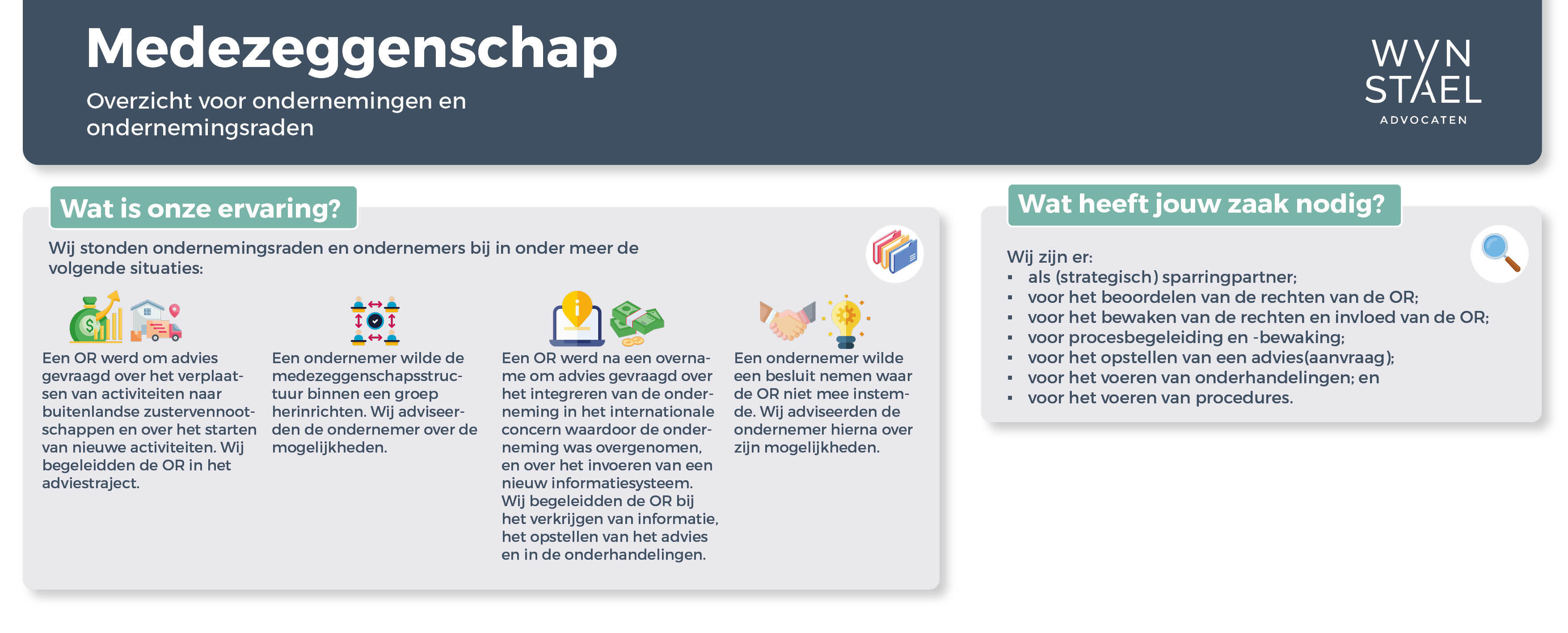 Wij staan zowel ondernemingen als ondernemingsraden bij in het creëren van goede medezeggenschap. Wij adviseren hen over hun rechten en plichten, begeleiden hen in medezeggenschapsprocessen, helpen bij onderhandelingen en zijn sparringpartner. Als het nodig is, voeren we procedures.
