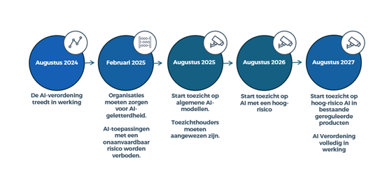 De AI-Verordening treedt getrapt in werking. Per februari 2025 worden bepaalde AI-toepassingen verboden en in augustus 2026 start het toezicht op hoog-risico AI-systemen. Dit ziet er in de tijdlijn als volgt uit: